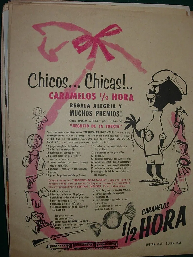 De todo lo dicho se desprende algo bastante inesperado: que el caramelo Media Hora fue novedoso en algún momento de la historia. Y algo todavía más sorprendente: que su target fueron los niños. El único aviso que circula en Internet, probablemente aparecido en la revista Billiken entre los años ‘50 y ‘60, exhorta a “chicos y chicas” a “comprar ½ HORA” y pedir “el boleto del ‘Negrito de la Suerte’”, que funcionaba como pase de entrada a una “festival infantil” (cuya fecha se anunciaría por televisión) en el que la empresa sorteaba diferentes premios. Según parece, este “negrito” (aunque su imagen era moneda corriente en la publicidad de la época) fue durante varios años el personaje “oficial” de Media Hora. La caramelera que la marca distribuía entre los kiosqueros más fieles, de hecho, llevaba la forma de su cabeza: el cráneo se descorría y surgían los caramelos. (Coleccionistas: un ejemplar definitivamente siniestro se consigue en Mercado Libre a $2500. Eso sí: el cráneo está un poco decolorido).