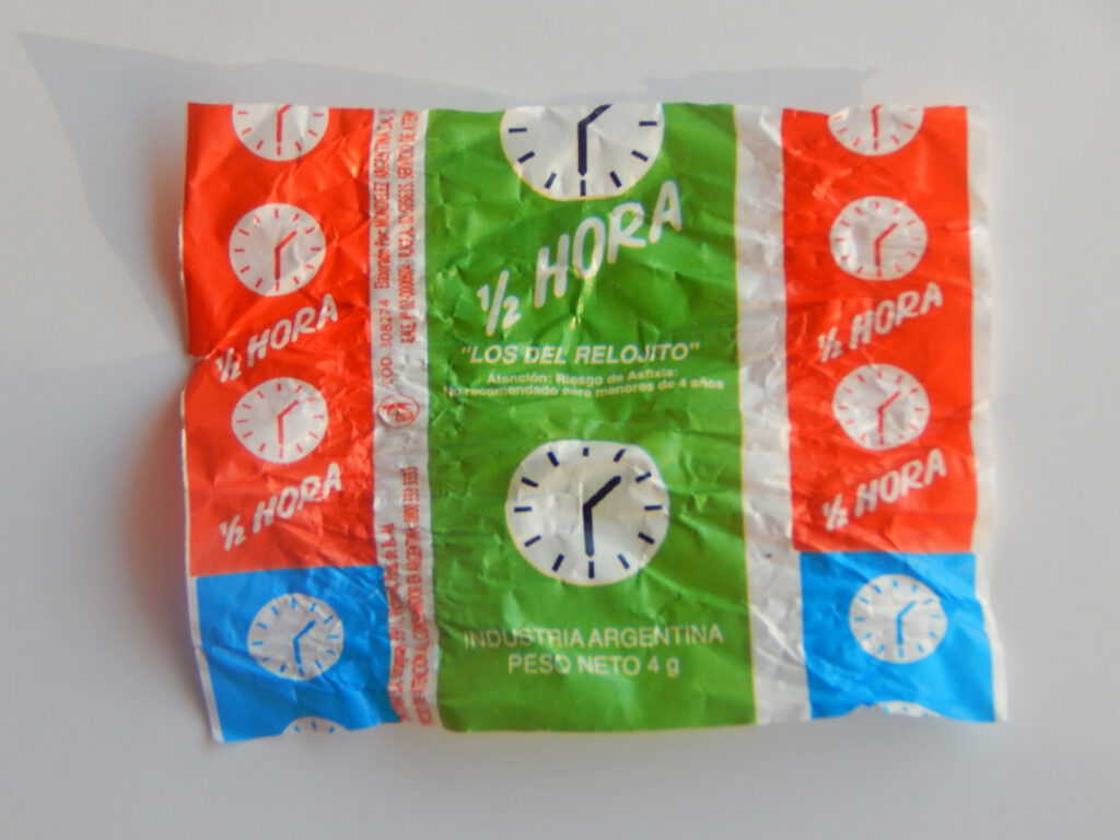 El Media Hora está, pues, a caballo entre dos generaciones: su sabor a anís y su parentesco con el orozuz —con todo lo que eso implica: su coloratura amarronada, el efecto anestésico que ejerce sobre la lengua— lo acercan a esa concepción premoderna —karma de dentistas y nutricionistas— en que lo medicinal y lo “hedónico” se confunden. Tal vez así se expliquen, finalmente, el significado de su nombre y la ilustración de su envoltorio. La tesis de Turner parece ser la más sólida: las agujas del reloj, clavadas en la una y media, indicarían el papel digestivo del caramelo, que, casi como por prescripción médica, debería consumirse luego del almuerzo, abriendo un espacio transicional de “media hora” entre la mañana y la tarde. (Vale aclarar que en la actualidad, según la mayoría de los experimentos, la duración en boca no supera los 22 minutos). Pero, por otro lado, el Media Hora también responde al nuevo paradigma de caramelo industrial, producido por unidad, en el que el packaging adquiere una importancia decisiva (en este sentido, el despliegue cromático de los distintos envoltorios del caramelo Media Hora debe ser considerados más bien una característica moderna, aunque sus colores opacos hoy luzcan tan envejecidos). Se trata de caramelos netamente orientados nítidamente al público infantil, que se desprenden del discurso “medicinal” para poner el énfasis en el placer, conforme al “modelo suizo” representado por compañías señeras como Suchard.