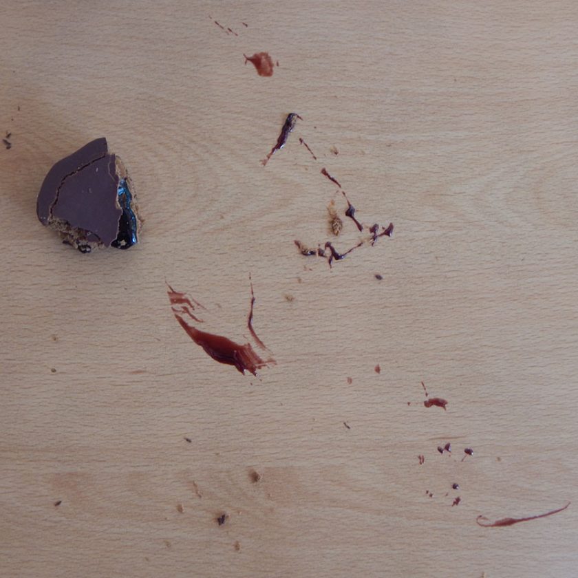 Generar unas falsas expectativas en el consumidor, e introducir en un marco tan vulgar una perturbación tan ominosa es, entonces, el giro conceptual que justifica la obra. Desdela cena de Eraserhead__ en la que en un muslo de pollo empieza a agitarse y a secretar una brea negra y viscosa, es conocida la eficacia de lo chorreante, entendida como una manifestación de lo onírico desatado que tanto sedujo al surrealismo (los relojes de Dalí también chorrean). Hice la prueba de dejar el alfajor partido a la mitad durante unos minutos. Cuando volví, la sustancia se había derramado por toda la mesa. Estaba endurecida, fosilizada.