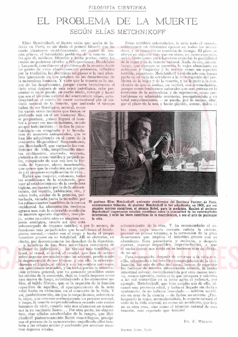 Probablemente la bibliografía —no citada— de este trabajo no fuera tan remota como indica Bioy. Basta con remitirse al archivo de revistas argentinas para dar con _un texto de 1916 _titulado “El problema de la muerte según Elías Metchnikoff”, en el que un tal Dr. F. Wilson expresa: “Ha recomendado el sabio ruso, cuya muerte reciente enluta la ciencia, proveer en primer término a la corrección de la gran desarmonía que implica el intestino grueso con su abundante flora parasitaria y malsana, y después esperar, esperar impasibles, imperturbables, a que el sueño eterno nos acoja en su inmenso mar de olvido, de no ser. Para conseguirlo (…) hemos de suprimir los factores de nuestra intoxicación crónica, la fauna intestinal salvaje, reemplazándola por otra menos nociva, menos agresiva, como es la que prospera y coloniza a las mil maravillas en la leche agria: el _yaohurt _, por ejemplo. Metchnikoff, que hizo amplio uso de ella, alcanzó una provecta edad, y hubiera llegado sin duda al centenario, de no haberse inoculado —sublime sacrificio en aras de la ciencia— de fiebre recurrente.”Otro artículo de 1907, de título “Por qué envejecemos. El elixir de la vida” y firmado bajo el seudónimo de Homais, demuestra que ya entonces (un año antes del Nobel al científico ruso) estaba de moda la teoría de que “para evitar las afecciones como las enfermedades, para no envejecer rápidamente, es preciso desalojar las putrefacciones intestinales”. (Paréntesis: Actimel se ha valido de __la imagen policíaca ___ en varias ocasiones, cien años después). Y más adelante: “El ideal consistiría en confiar la desinfección a seres vivientes o, como se ha dicho, a una policía compuesta de buenos microbios (…). Son los fermentos lácticos, a los cuales la leyenda atribuye, no sin visos de verdad, el mérito del vigor y longevidad fenomenales de los búlgaros, quienes, como es sabido, se nutren casi exclusivamente de «yonghourt», es decir, de leche cuajada”. Luego una imagen mostraba a una fila de ancianos sentados, y en el epígrafe ponía: “Estos Matusalenes de 50 a 70 años, serían niños de pecho en Bulgaria”. La cosa trasciende las fronteras nacionales: “La leche cuajada, elíxir de larga vida” era el nombre de otro folleto informativo escrito por el Dr. Monteuuls que se promocionaba en _una revista de Madrid _de principios del siglo XX. _