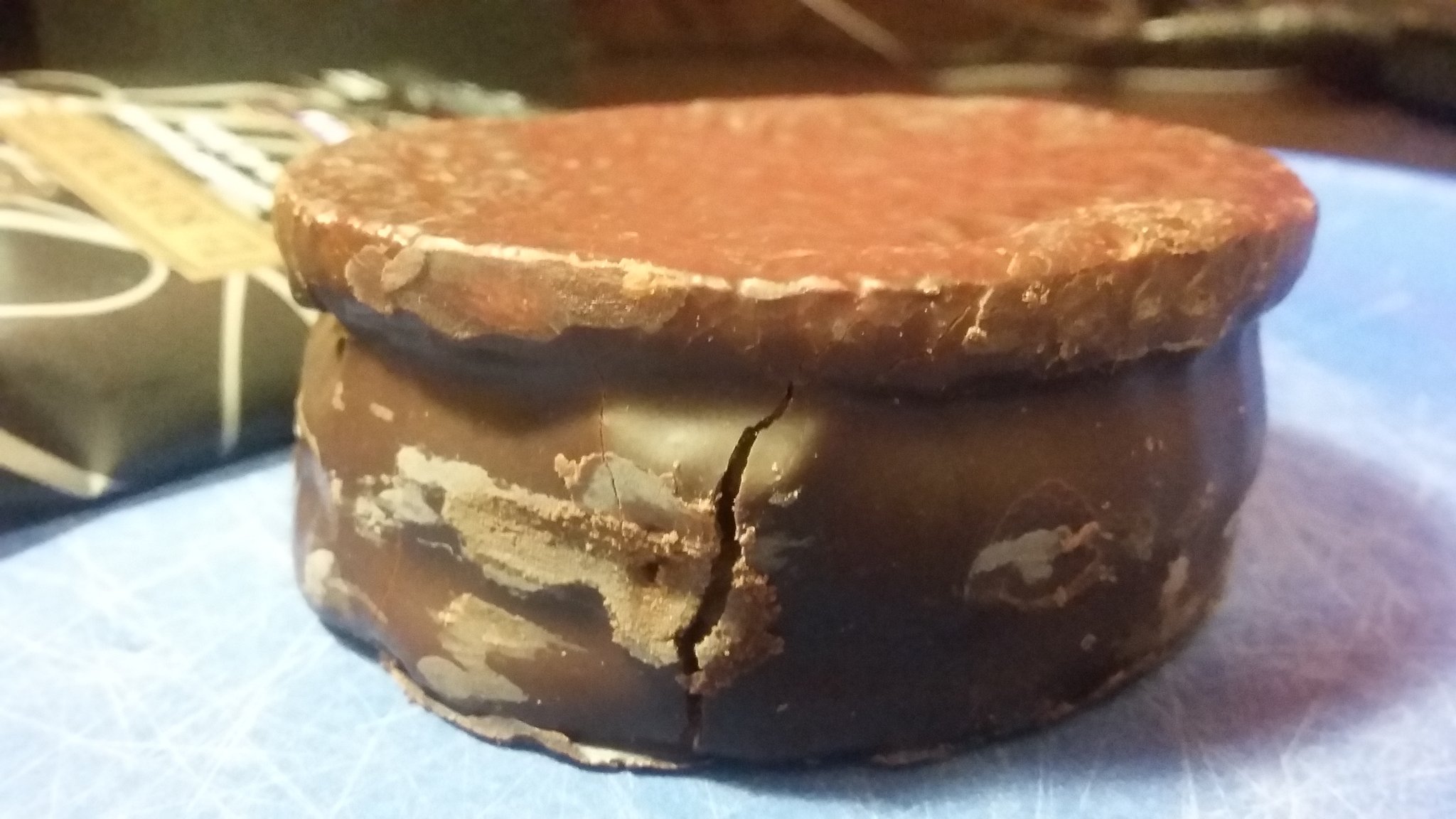 El alfajor La Recoleta no merecería el calificativo de muy malo si se promocionara como el Grandote, pero se autodenominan “Premium” y tienen un paquete bastante pretencioso, y bajo esos parámetros da ganas de llorar. Por cierto, este alfajor pesa 72 gramos y aporta 269 calorías. Se asemeja, en cuanto a tamaño e información nutricional, al Vauquita (80 gramos, 297 calorías). Son dos casos raros, porque siendo dobles pesan casi como un triple. La sospecha comenzó, como suele ocurrir, al olerlo. Era definitivamente un olor dudoso, ambiguo, que tenía más de limón que de chocolate , galletita o dulce de leche. Al chocolate (a su imitación, porque es repostería) costaba percibirlo. Una exagerada cantidad de limón artificial para disimular otros olores —o bien su ausencia— es una jugarreta imperdonable, creadores de alfajores. Por supuesto, estos temores se vieron confirmados cuando saboreé un pedacito de cobertura que salió volando al cortar al alfajor en dos. Ahí directamente emití un “mmm” audible. Pero no de placer, sino de desconfianza creciente.